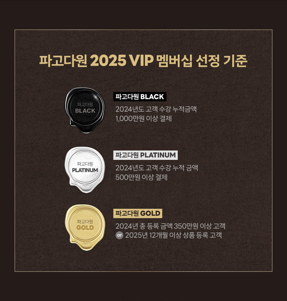 - - 매년 1월 1일 ~ 12월 31일 누적 수강 결제 금액에 따라 다음 해 VIP 회원이 선정됩니다.