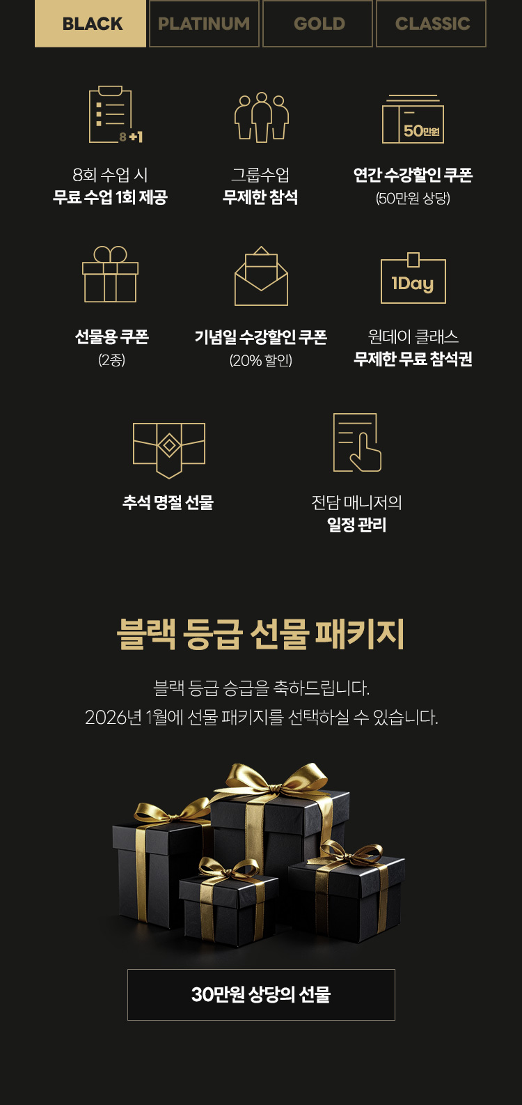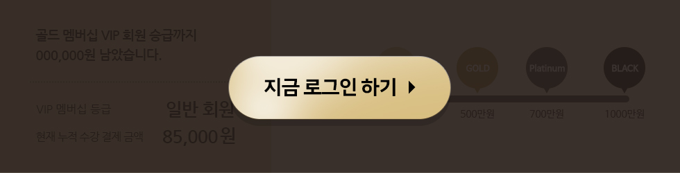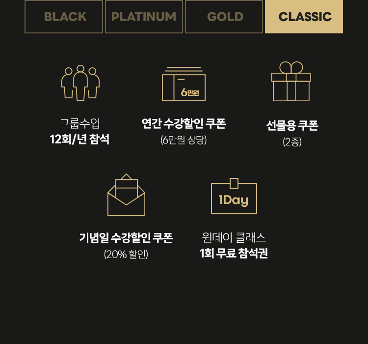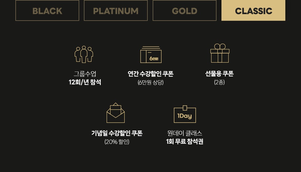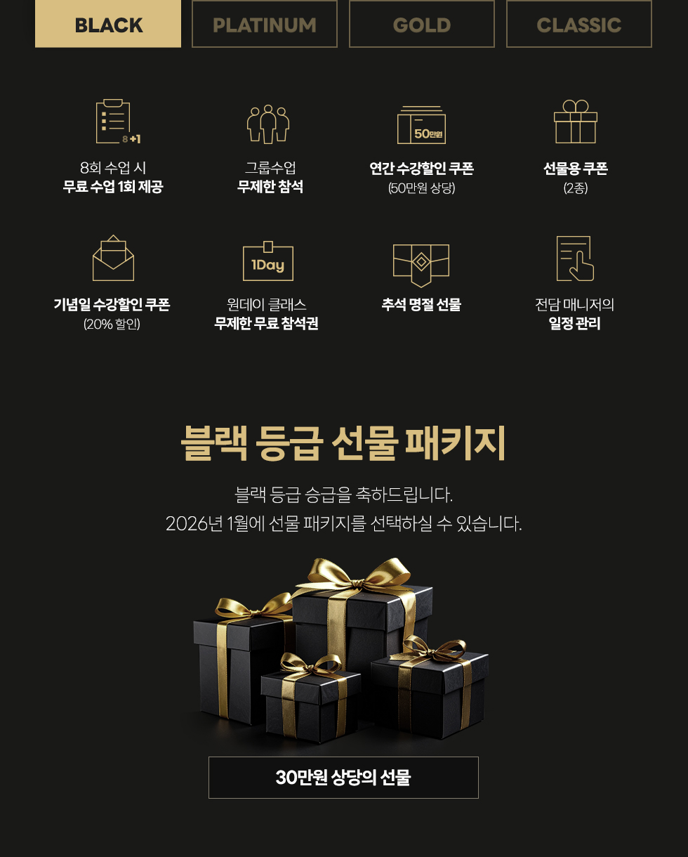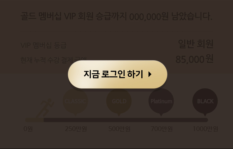 (CLASSIC : 250만원 이상, GOLD : 500만원 이상, PLATINUM : 700만원 이상, BLACK : 1,000만원 이상) - - VIP 회원은 매년 1월 1일 자동 승급되어 홈페이지 마이클래스에서 확인 가능합니다.