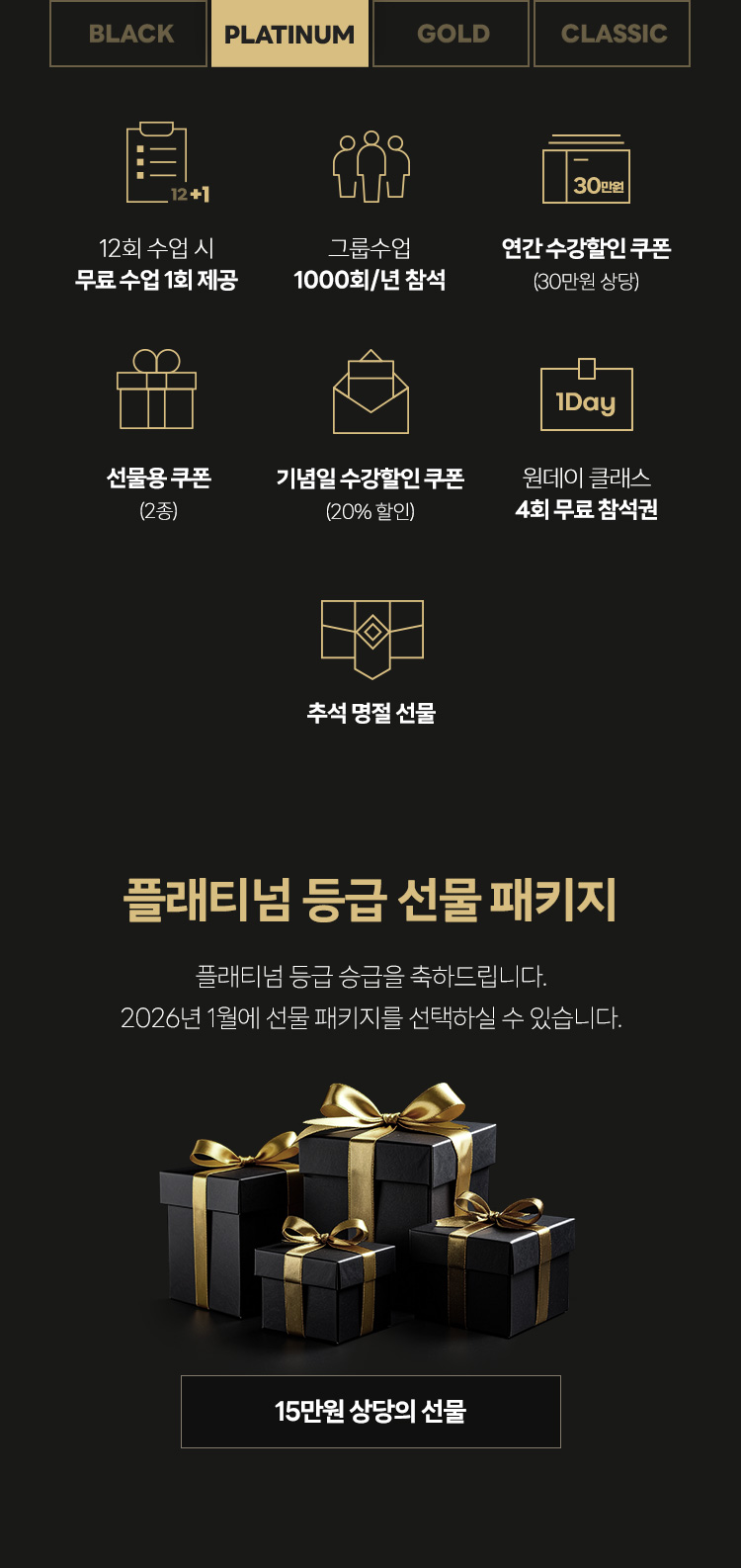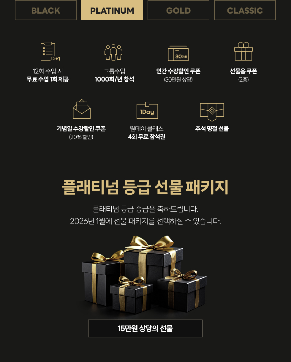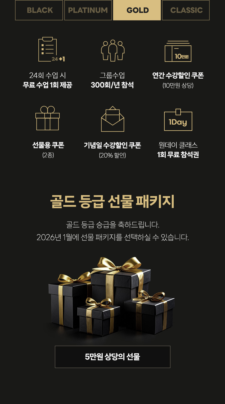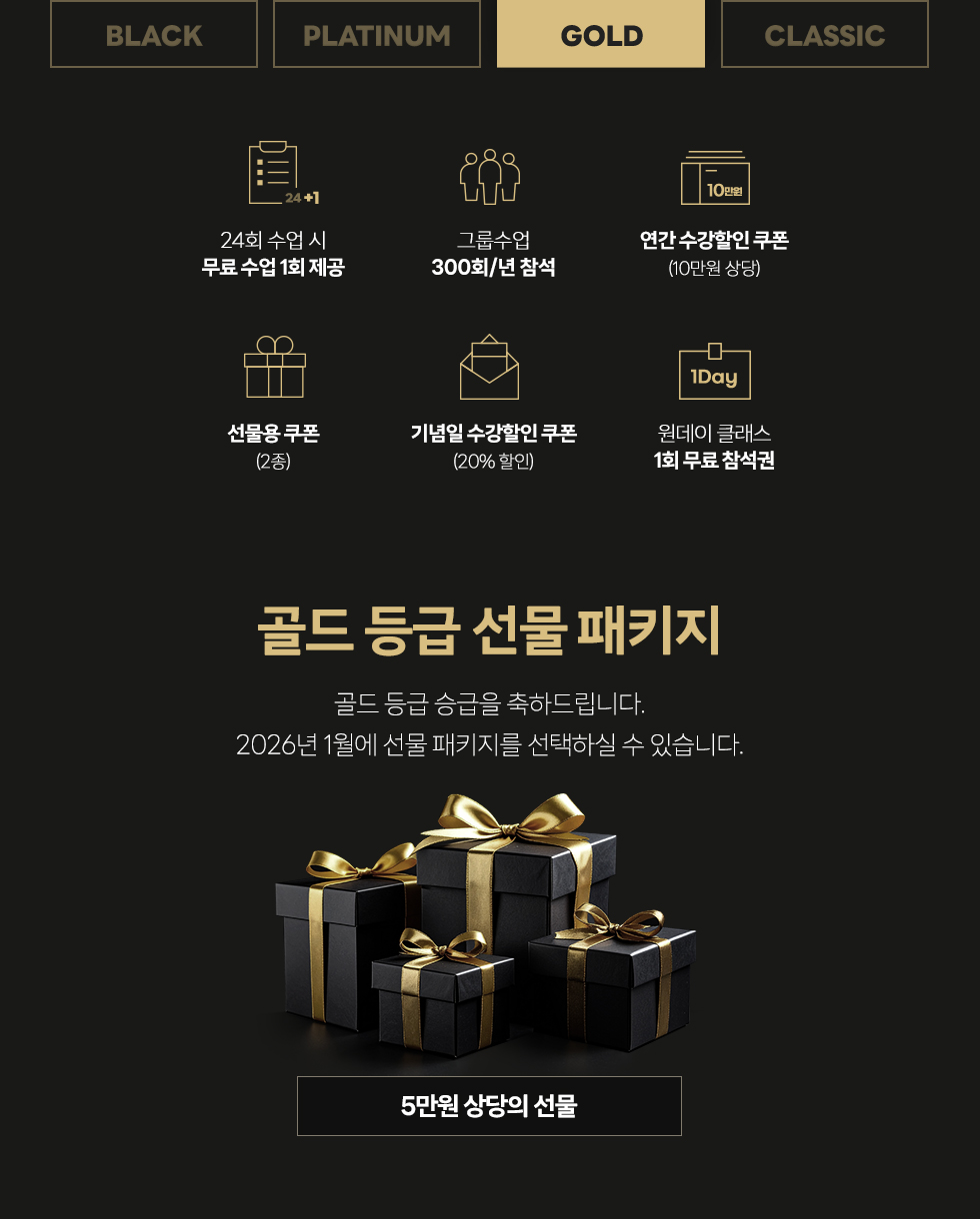 - - 26년도 12개월 이상 패키지 결제로 GOLD 멤버십이 되신 분들은 27년도에 기념일 할인 쿠폰과 승급선물 제공 됩니다.